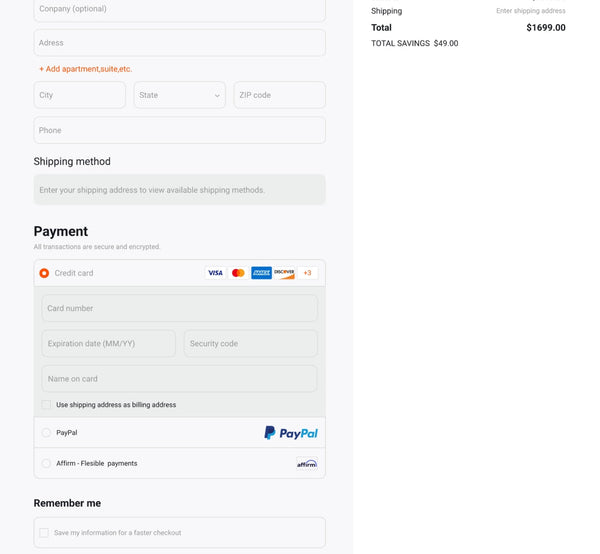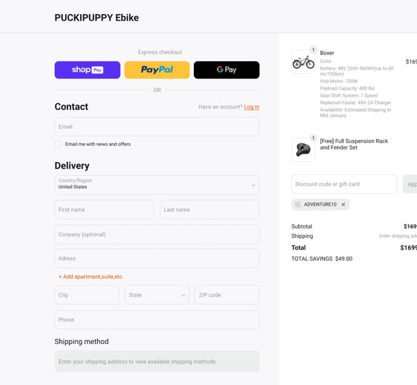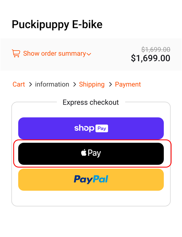 After reaching the checkout page, choose your desired method of payment. You can choose the quick checkout method by Paypal, Shop Pay or Apple Pay if you already have an account.If not, please proceed to filling your information on the bottom and click continue to shipping.